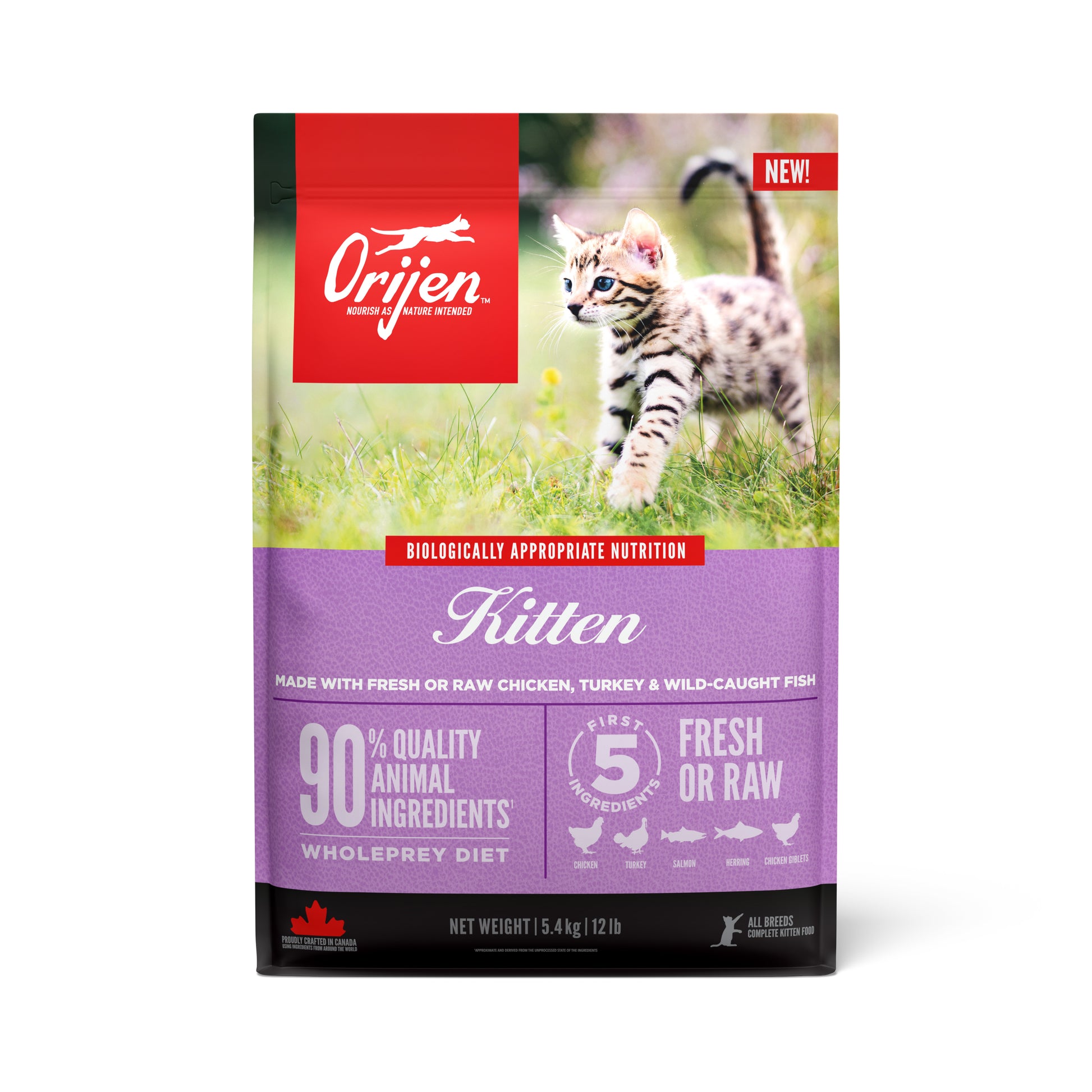 ORIJEN™ Kitten diet is specially formulated to give your kitten the nutrients they need to grow and properly develop. Packed with 90%1 animal ingredients like free-run2 chicken and turkey and wild-caught salmon and whole herring, it helps support muscle development in your growing kitten. It also contains 16 animal ingredients, including WholePrey ingredients like poultry, fish, organs and bone, the most succulent and nourishing parts of the prey. This diet helps support your kitten's brain development and cognitive function with naturally occurring DHA and EPA from salmon, whole herring, and pollock oil. Your kitten will thrive when you feed them the fresh and raw animal ingredients they need.